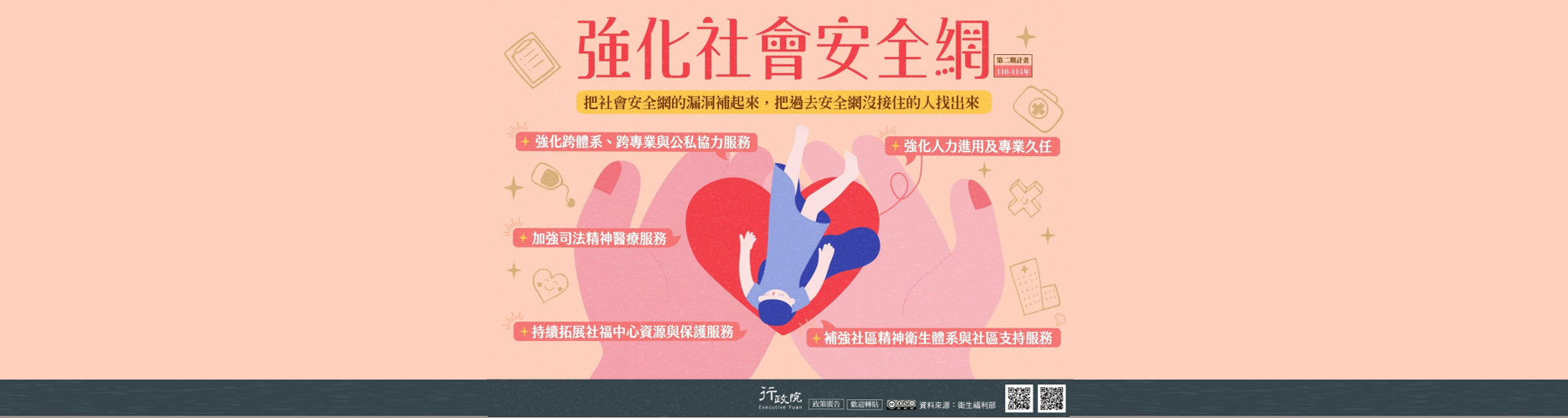 行政院於107年2月26日核定「強化社會安全網計畫」,結合政府各部門的力量,建構一張綿密的安全防護網,扶持社會中的每一個個體,在生活或所處環境出現危機時,仍能保有生存所需的基本能力,進而抵抗並面對各種問題。